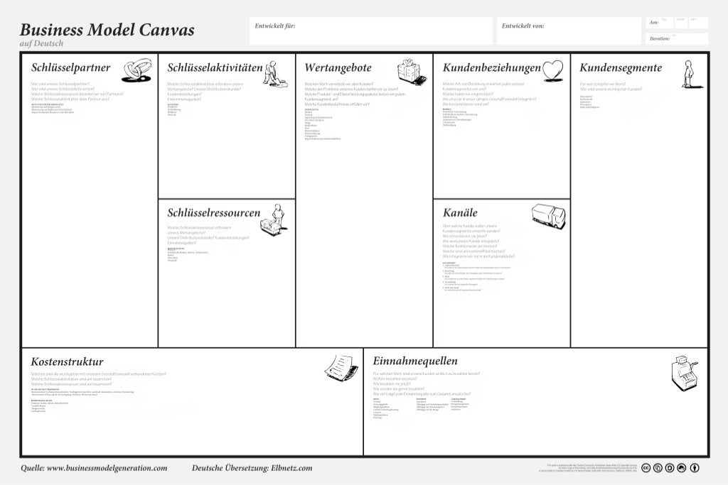 Die „Original“ Businessmodell Canvas ist als Creative Common Lizenz frei verfügbar. Es gibt aber auch eine deutschsprachige Version, die von dem Unternehmen elbnetz.com übersetzt und ebenfalls mit einer Creative Common Lizenz der Allgemeinheit zur Verfügung gestellt wird.