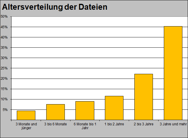 79% der Dateien waren älter als ein Jahr, 45,3% sogar mehr als drei Jahre alt. Wir waren uns einig, dass grob geschätzt 75-85% der Dateien „veraltet“ waren – veraltet in dem Sinne, dass sie nicht mehr im regelmäßigen Zugriff benötigt wurden. Dass man sie aber nicht physisch löschen durfte wegen gültiger Aufbewahrungsfristen.