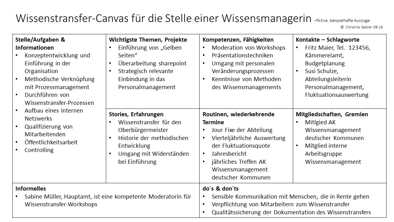 Vor dem Workshop dient ein erstes Gespräch der Moderatorin mit der Wissensgeberin und der Führungskraft der Klärung des Auftrags. Dabei werden die wesentlichen Inhalte des Wissenstransfers besprochen und die Teilnehmenden ausgewählt. Die Wissensgeberin bereitet sich auf den Workshop vor und stellt relevante Informationen zusammen. Die Moderatorin wiederum sorgt für die leeren Plakate und Medien zur Dokumentation. Nach dem Workshop können die notierten Themen zum Beispiel in dem MS-Office-Tool OneNote in ein Logbuch übernommen werden. Anschließend wird der Entwurf von der Wissensgeberin überarbeitet und – sofern die Zeit vorhanden ist – um Informationen wie z. B. Kontaktdaten ergänzt. Hier ein Beispiel für einen Wissenstransfer mit einer Wissensmanagerin, ansatzweise ausgefüllt: