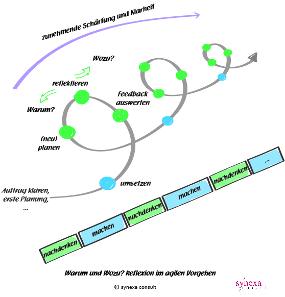 Agile Teams sind tatkräftig. Und oft auch sehr schnell – Ideen produzieren, Wege entwickeln, umsetzen, erproben, verändern, weitermachen. Manchmal vielleicht zu schnell. Das Problem: „Wer rudert, sieht den Grund nicht.“ (Wilhelm Busch) Und verliert manchmal den Überblick, ob man noch den eigentlich angepeilten Kurs hält. Eine kluge Abfolge aus „Machen“ und „Innehalten/Reflektieren“ gehört deshalb eigentlich zum festen Programm agilen Arbeitens. Aktive, kreativ sprühende Teams müssen sich jedoch manchmal regelrecht zum Innehalten zwingen. Systematische Fragen haben sich deshalb als probates Mittel erwiesen, in die ,reflexive Schleife‘ einzutauchen und das Nachdenken zu leiten.
