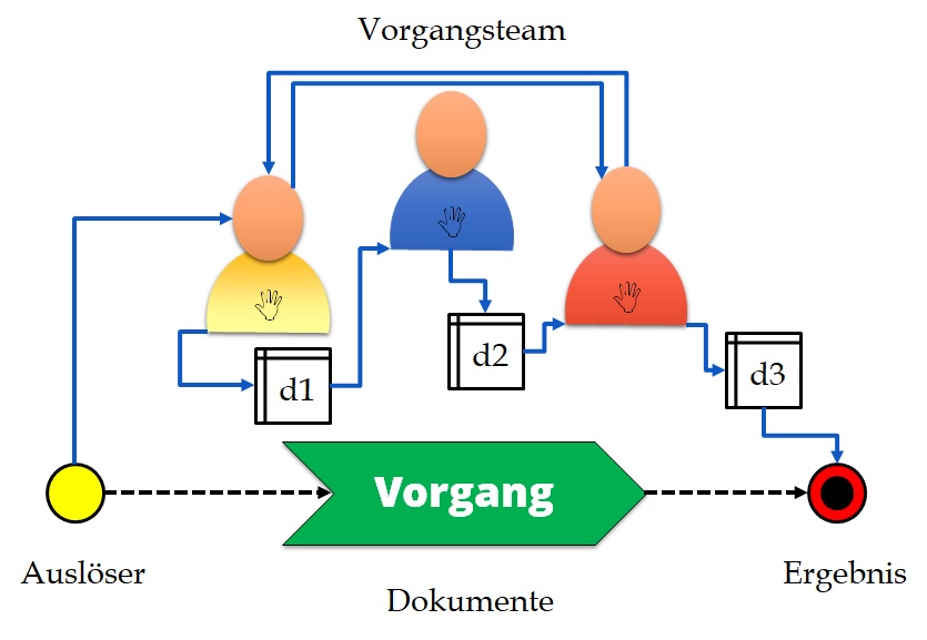 Die Funktion von Dokumenten in einem Vorgang kann sehr unterschiedlich sein und ihre Wege verschlungen. Viele Transaktionen zwischen Mitgliedern eines Vorgangsteams finden ganz ohne Dokumente statt, andere wiederum sind stark dokumentenzentriert.