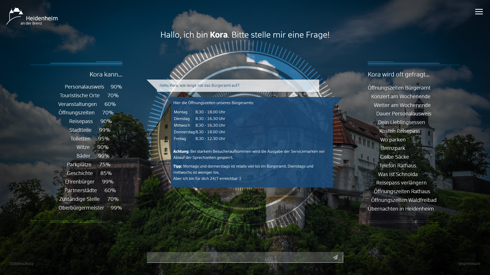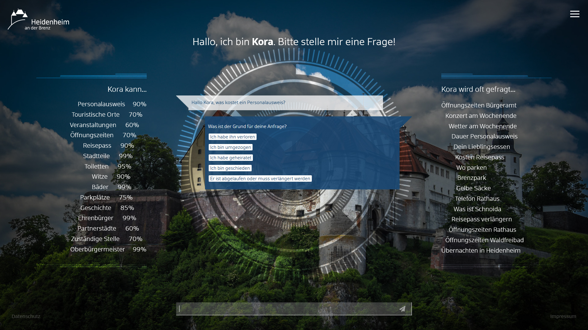 „Kora“ steht für Kommunale Rathaus-Assistentin. Sie kann seit dem 11. Juni 2018 als offene Betaversion auf www.heidenheim.io getestet werden. Offene Betaversion deshalb, weil Kora noch kein vollumfängliches und finales Produkt ist.