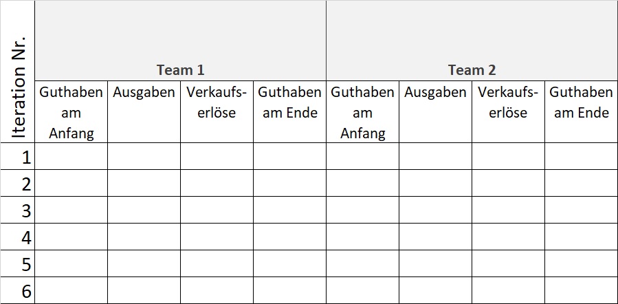 Nach jeder Runde notiert der Anwendervertreter, wie viel Geld jedes Team hat. Dafür wird für Zählboard auf ein Flipchart gezeichnet, das bei zwei Teams so aussieht: