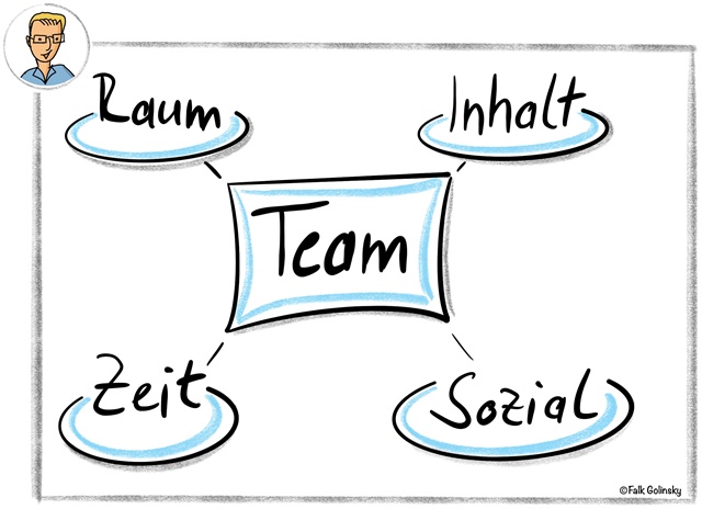 Peter weiß, dass jede Veränderung oft damit beginnt, dass die bisherigen Muster durchbrochen werden. Es bedarf einer ganz konkreten Intervention. Genau diese erste Intervention muss anschlussfähig sein, um im Team anzukommen und etwas auszulösen. Bereits an dieser Stelle macht sich Peter viele Gedanken. Er kennt bereits das IT-Team und kann seine Eindrücke in seine Überlegung mit einbinden. Er nimmt sich einen Stift und beginnt 4 wichtige Dimensionen zu skizzieren.