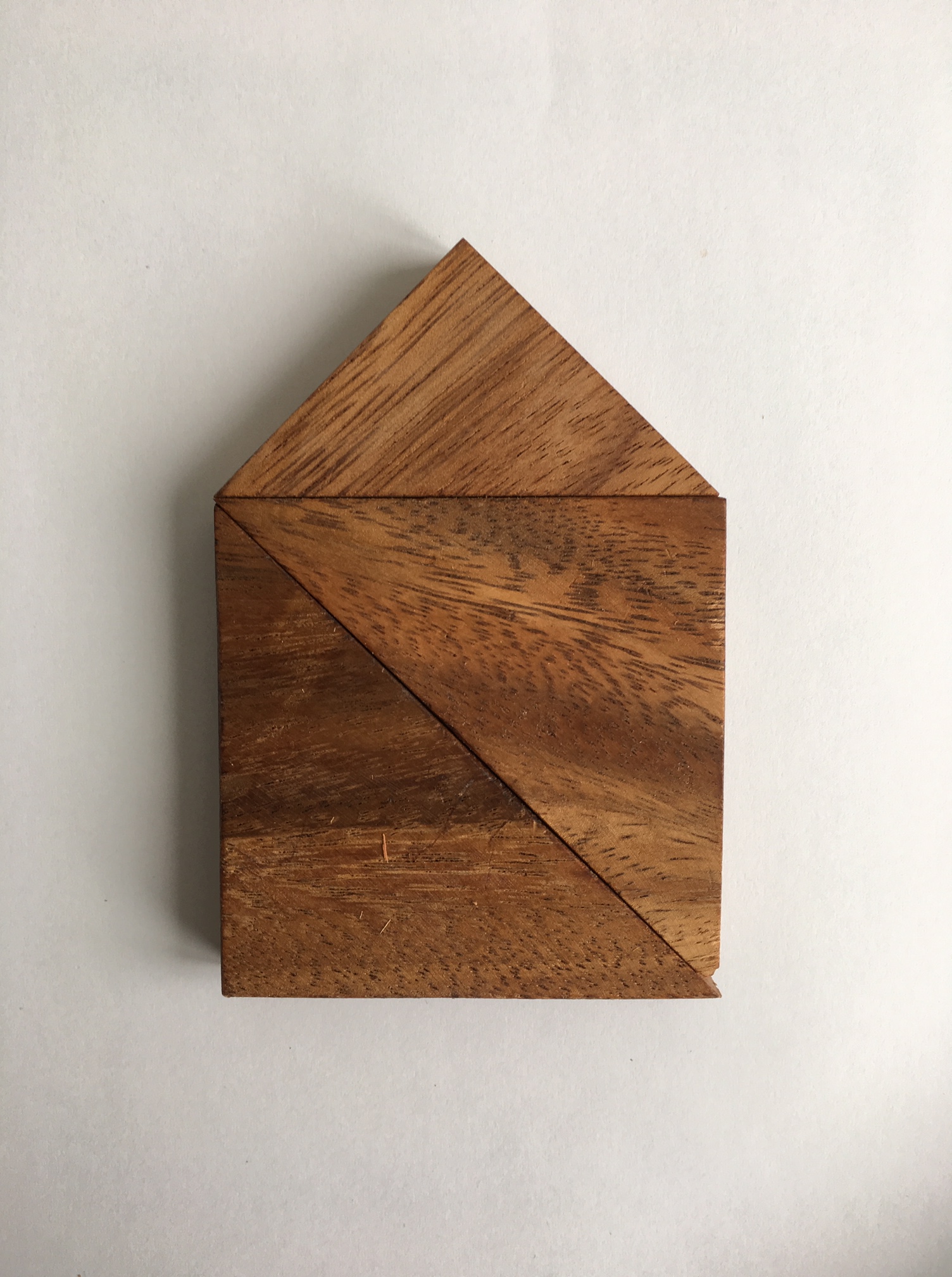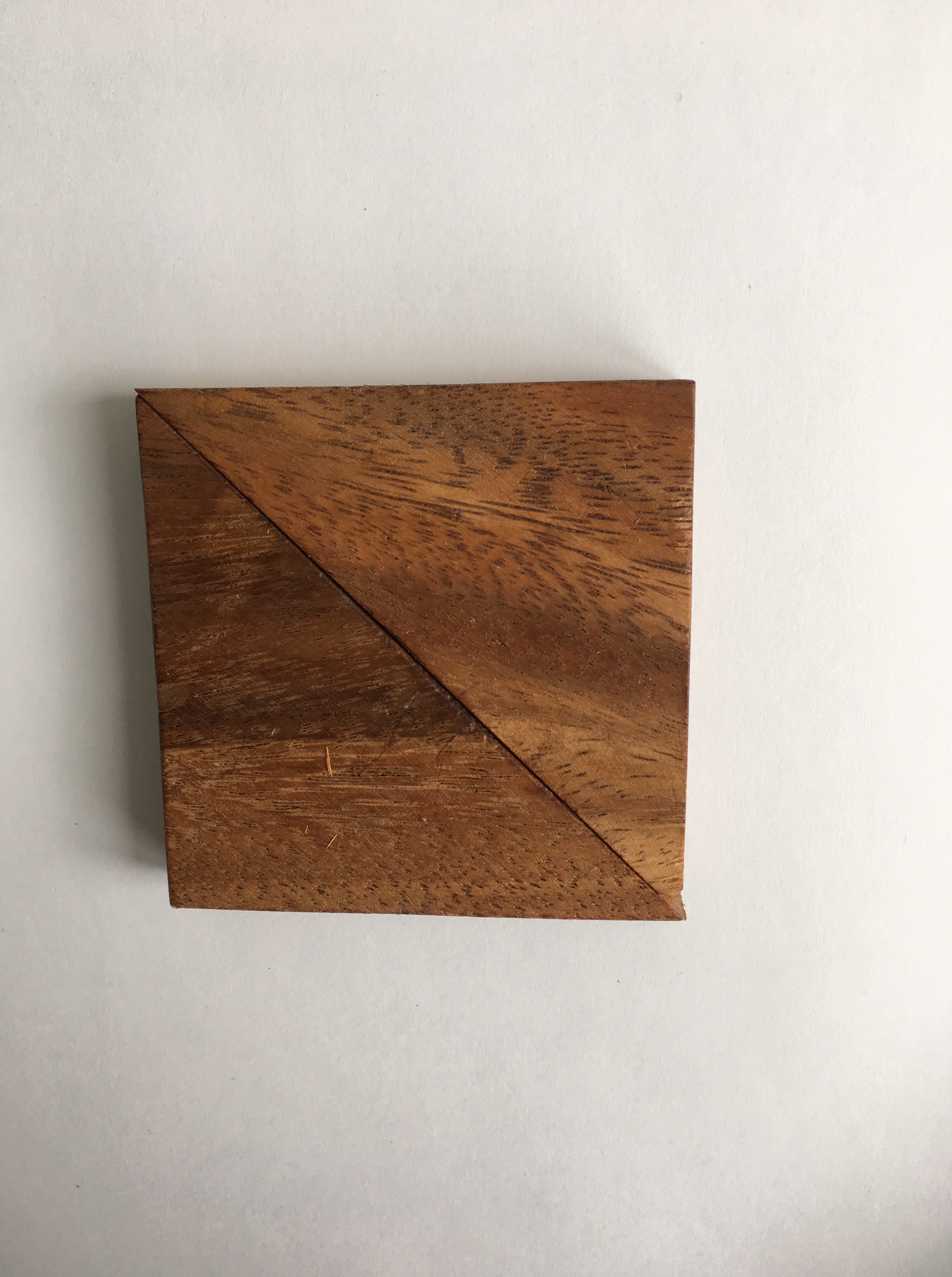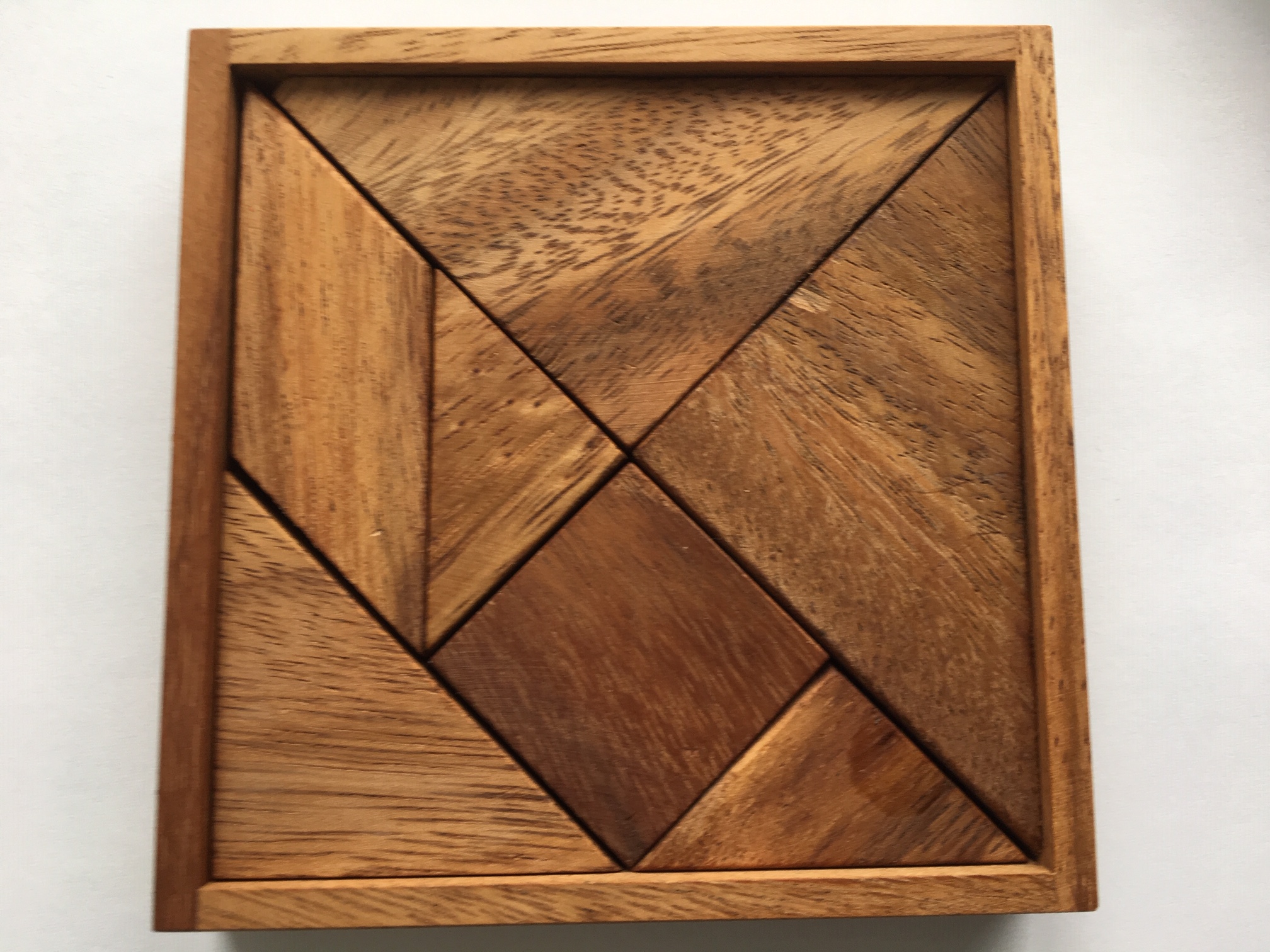 Tangram ist ein Set von Puzzleteilen aus Holz, die zusammen ein Quadrat ergeben.