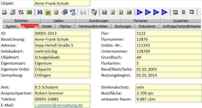 Abbbildung 1 zeigt eine von vielen Masken in einem weit verbreiteten Fachverfahren für Gebäudemanagement, das auch in einigen öffentlichen Verwaltungen eingesetzt wird. Eine sehr große Anzahl von Stammdaten kann auf diese Weise in einheitlicher Form verwaltet und zur Verfügung gestellt werden.