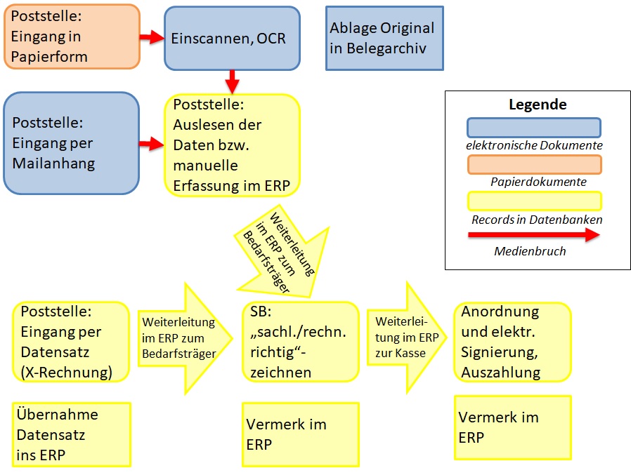 Künftig soll es möglichst keinen „Medienbruch“ mehr geben. Insbesondere dürfen elektronisch eingehende Rechnungen (sei es direkt in Datensatz-Form, sei es als E-Mail-Anhang = pdf) nicht mehr ausgedruckt werden.