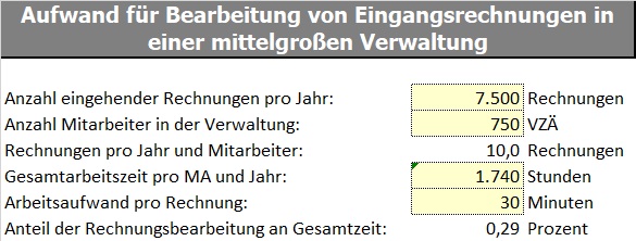 Das Mengengerüst meines Artikels wurde kritisert. Ich habe es einem Artikel der „Innovativen Verwaltung“, Heft 5/2019, über eine Bundesbehörde entnommen. (Wir haben es vor einigen Jahren selbst in einer Landkreisverwaltung erhoben und kamen auf 0,6% der Gesamtarbeitsleitung für E-Rechnungen statt auf 0,3% im Artikel. Das ist angesichts eines mehrjährigen Projekts größenordnungsmäßig kein großer Unterschied.)