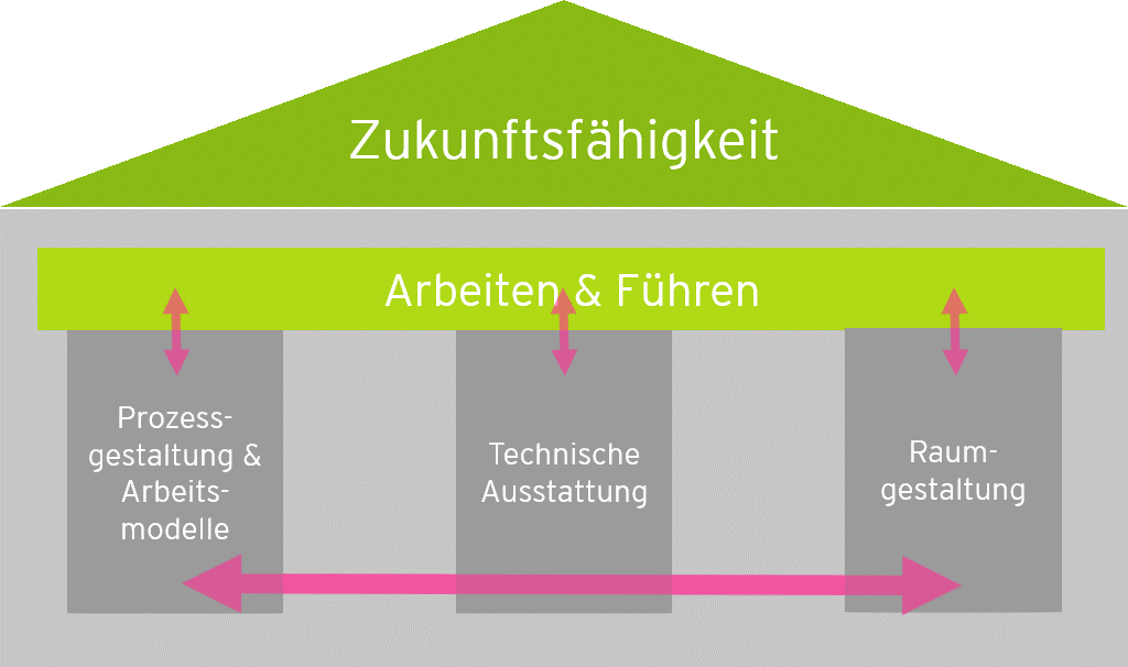 „Für die Zukunftsfähigkeit reicht IT gestützte Geschäftsprozessoptimierung (GPO) alleine nicht aus. Es müssen in gleichem Maße die Themen Arbeiten & Führen, die technische Ausstattung und die Raumgestaltung mit verändert werden.“