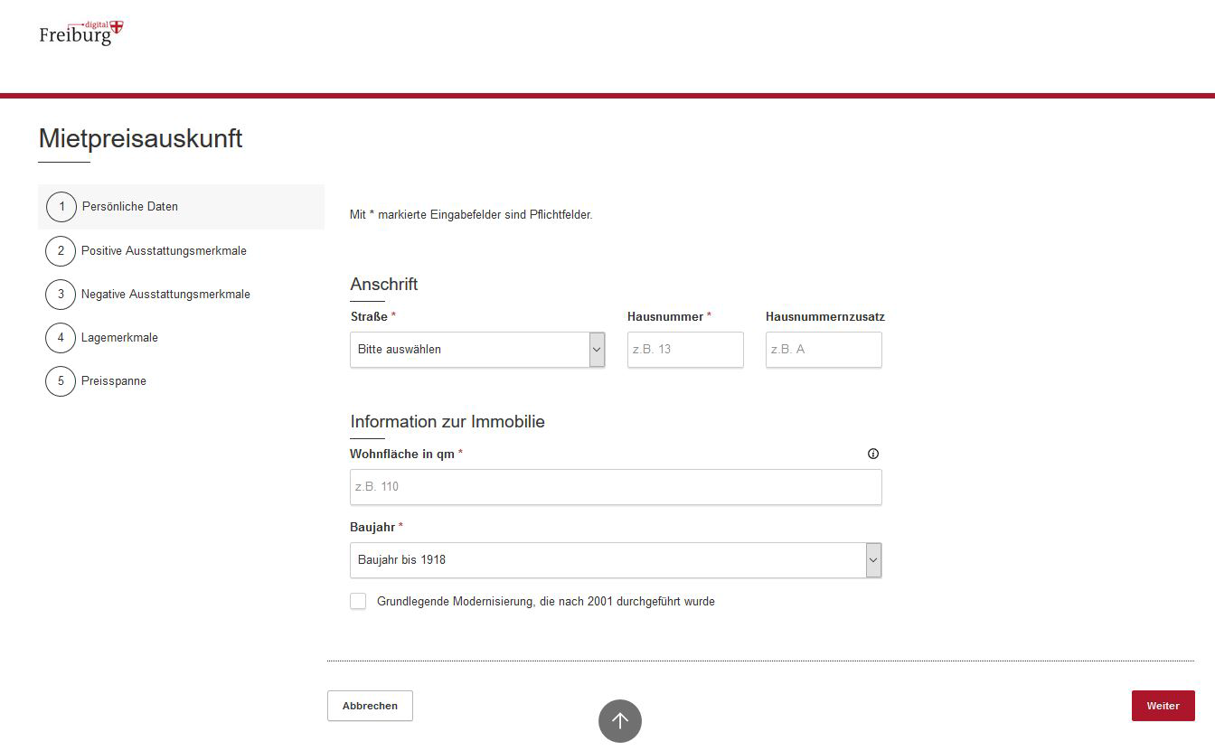 Die Stadt Freiburg stellt unter www.freiburg.de/mietpreisauskunft die Online-Mietpreisauskunft bereit. Damit kann jeder die ortsübliche Vergleichsmiete kostenlos und mit wenigen Klicks ermitteln.
