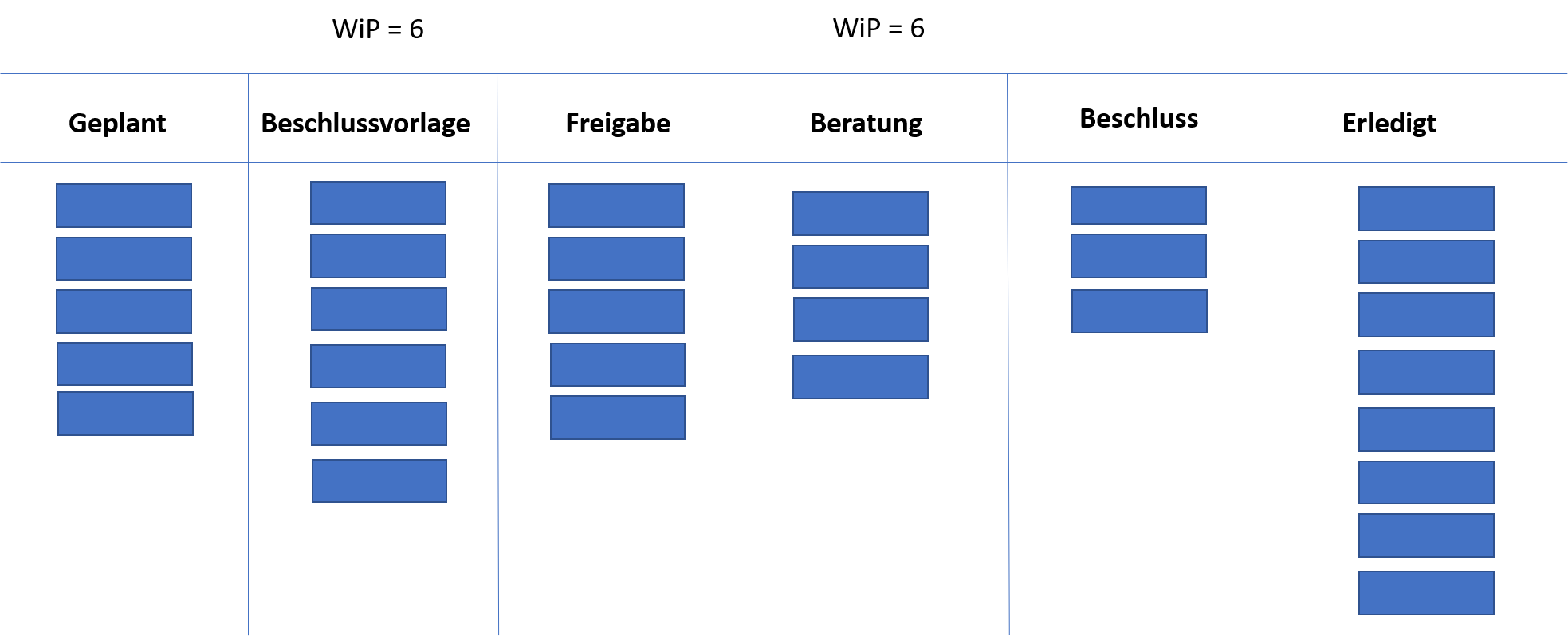 Die Limitierung der parallelen Arbeit gehört zu den wesentlichen Punkten, die den Unterschied zwischen einem Ticketsystem und Kanban ausmachen. Die Begrenzung der parallelen Arbeit verhindert, dass das Arbeitssystem verhungert oder verstopft. Ziel von Kanban ist ein nachhaltiger, kontinuierlicher Arbeitsfluss, der zu einer kontinuierlichen Ergebnislieferung führt. Tatsächlich führt die Limitierung der parallelen Arbeit dazu, dass mehr in gleicher Zeit geleistet werden kann. Statt Unmengen begonnener, aber nicht abgeschlossener Vorgänge, bedingt durch immer wieder auftretende Unterbrechungen und ständige Neupriorisierungen, sorgt die Limitierung (kurz WiP-Limit) dafür, dass neue Arbeit erst dann nachgeschoben werden kann, wenn das Limit unterschritten wird. Und seien wir ehrlich: wie viele offene Vorgänge haben Sie auf Ihrem Schreibtisch liegen, die Sie noch nicht abgeschlossen haben, weil ständig neue Themen auftauchen und „dringend“ bearbeitet werden müssen? Richtig! Die Idee dahinter ist simpel und lässt sich in einer Metapher schön demonstrieren. Jeder Jongleur kann nur eine begrenzte Anzahl Bälle in der Luft halten. Kommt auch nur ein Ball zu viel dazu, bricht die Jonglage zusammen. Ähnlich verhält es sich mit der Arbeit. Wir können nur eine begrenzte Zahl paralleler Projekte oder Vorgänge gleichzeitig abarbeiten. Überschreiten wir diese Anzahl, bricht unser Arbeitsfluss zusammen, und wir werden unproduktiv. Diese Erkenntnis lässt sich auf Teams, Prozessketten und ganze Organisationen übertragen.