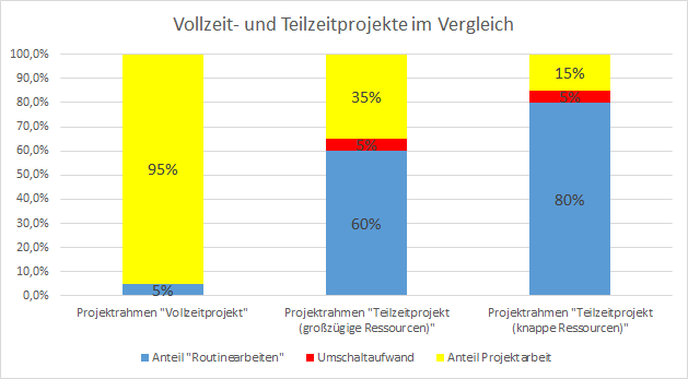 Die Abbildung vergleicht drei unterschiedliche Konstellationen. Im ersten Fall ist ein Mitarbeiter mit seiner ganzen Arbeitszeit im Projekt tätig. Das beschäftigt ihn zu 95%. Es gibt ein paar kleine Routinearbeiten, vor allem Abstimmungen mit den Abteilungskollegen in der „Linie“, aber die machen nur 5% (ca. 2 Stunden die Woche) aus.