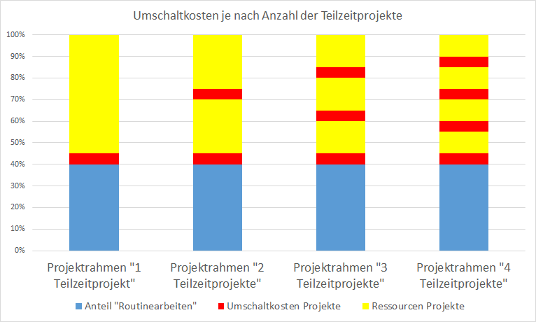 Nehmen wir an, ein solcher Mitarbeiter hat jeweils 60% seiner Zeit für Projekte zur Verfügung und muss nur 40% für Routine aufwenden. Diese Projekte kann er einmal für ein einziges Projekt verwenden, oder er muss es – so stellen es die Säulen rechts dar – auf eine zunehmende Anzahl von Projekten verteilen.
