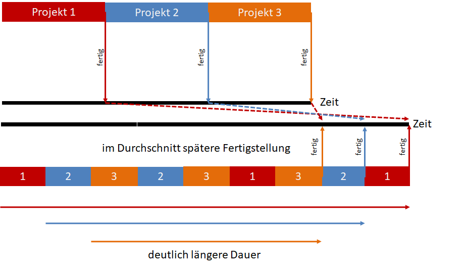In der unteren Hälfte wird ein Projektverlauf gezeigt, bei dem das Projektteam dauernd zwischen den Projekten hin und her springt: erst 1, dann 2, dann 3, dann wieder 2, dann 3 usw. Die Dauer der drei Projekte ist jetzt länger (4 Monate), wegen der Switching Costs des vorigen Abschnitts. Aber vor allem das Hin- und Herspringen führt zu Verzögerungen: