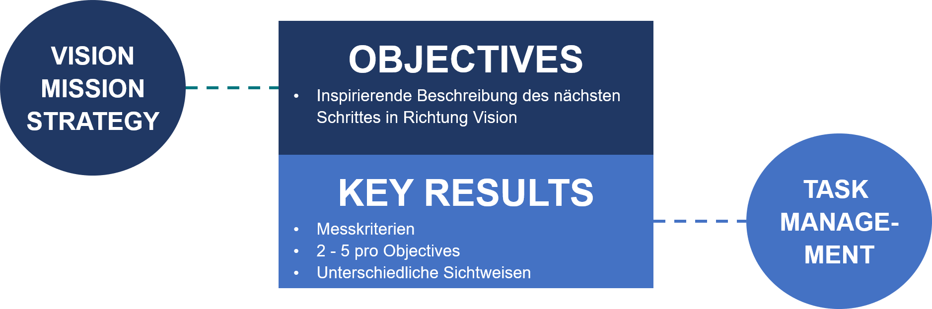 • in einem vierteljährlichen Rhythmus findet eine Feedbackschleife statt, bei der die Ergebnisse überprüft und die Ziele sowie die abgeleiteten Schlüsselergebnisse fortgeschrieben und angepasst werden (Review)