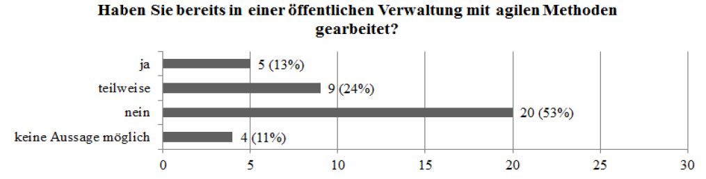 Die Auswertung der Umfrage zeigte, dass bereits 37% der Befragten Mitarbeiter*innen aus öffentlichen Verwaltungen mit agilen Methoden in Berührung gekommen sind. (s. Abbildung 1). Über 50% der Befragten haben noch keine Erfahrung in der Verwendung von agilen Methoden in öffentlichen Verwaltungen und 11% (N=4) der Befragten konnten keine Aussage treffen.