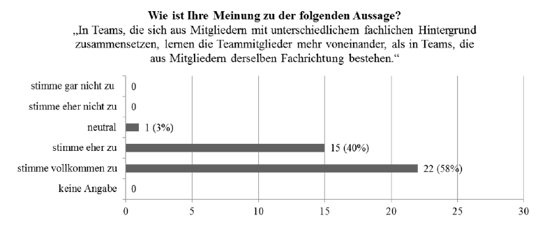 Diese These, dargestellt in Abbildung 3, wurde gewählt, da beispielsweise in Scrum die interdisziplinäre Zusammenarbeit im multifunktionalen Team im Fokus steht. Das Item zeigt den Wunsch nach interdisziplinärer Teamarbeit. Der These stimmen über 50% der Befragten vollkommen zu. 40% (N=15) der Befragten stimmen “eher zu” und 3% (N=1) der Befragten stehen der Aussage neutral gegenüber. Insgesamt zeigt sich, dass Keiner der Befragten der Aussage negativ gegenüber steht.