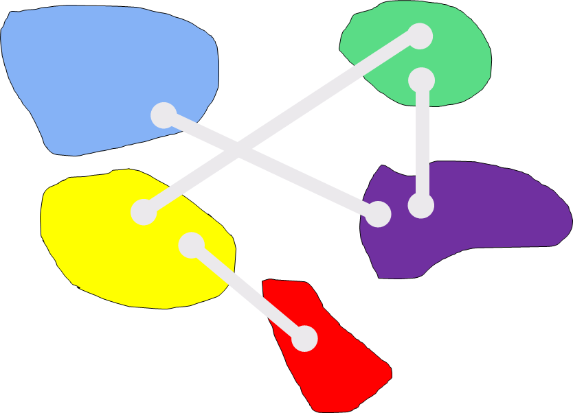 Agile Vernetzung von Initiativen: aus Initiative „Gelb“ geht ein Vertreter als Zuhörer in Treffen der Initiative „Rot“ usw. Das Ziel ist, dass wenn Initiative „Rot“ sich einer Fragestellung widmet und Initiative „Grün“ dazu schon etwas entwickelt hat, dass dann Grün die Chance hat, von Rot zu erfahren. Das würde mit der relativ simplen Netzstruktur der Abbildung funktionieren. Nicht jede Initiative muss sich mit jeder anderen vernetzen, es muss nur jeweils eine indirekte Verknüpfung geben. Dann kann schon Wissen fließen.