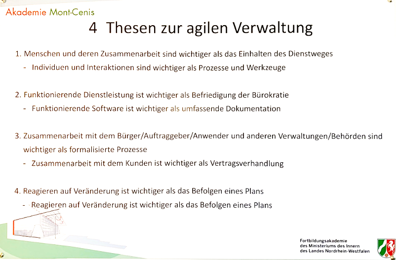 Erstmals vorgestellt habe ich die vier Thesen zur agilen Verwaltung auf dem New Work Day der Akademie Mont-Cenis (Fortbildungsakademie des Ministeriums für Inneres und Kommunales des Landes Nordrhein-Westfalen). Die Initiatorin der Veranstaltung, Frau Kaul (Fachbereichsleiterin Digitalisierung in der Landesverwaltung) hatte die Thesen zusammen mit den Original-Formulierungen aus dem agilen Manifest auf Plakate gedruckt und im Raum aufgehängt. Ursprünglich war meine Idee, damit eher provokante Thesen zu formulieren, um die Diskussion in Gang zu bringen. Um so erstaunter war ich über die Reaktionen: Zum Veranstaltungsende war fast kein Plakat mehr übrig, weil wir so viele Anfragen von den ca. 120 Teilnehmern bekommen haben, ob sie ein Plakat mitnehmen dürften, um es in ihrer Verwaltungseinheit aufzuhängen. Offensichtlich entsprachen diese Thesen genau dem, was sie sich vorstellten und wünschten.