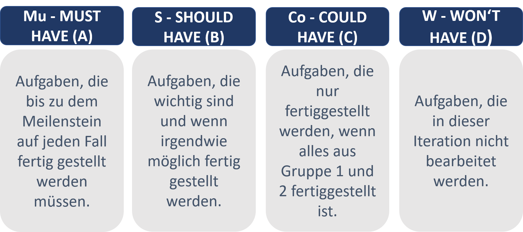 Vergleichsweise einfach umzusetzen ist die MuSCoW-Methode. Hier wird in vier Kategorien unterschieden: