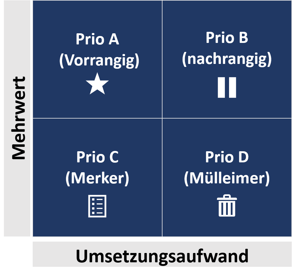 Eine Variante der Eisenhower-Matrix ist die Priorisierung nach Umsetzungsaufwand und Mehrwert bzw. Nutzen.