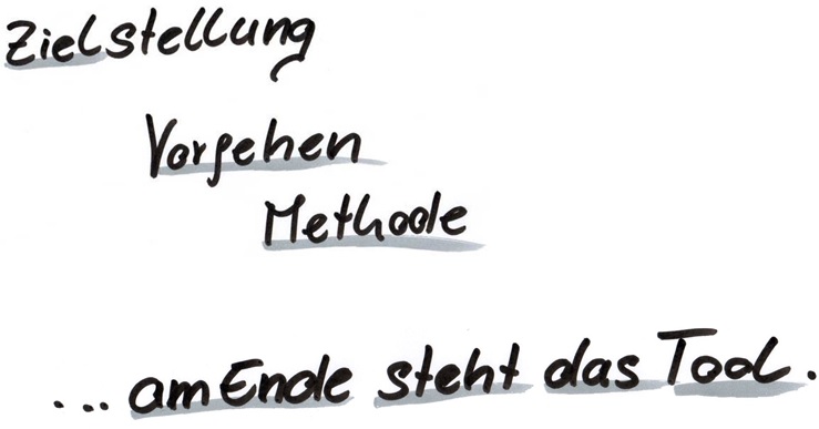 Wenn ein Team sich professioneller organisieren will, dann muss es sich erst einmal über die eigenen Zielstellungen klar werden. Dann muss es sich über das grundsätzliche Vorgehen auf dem Weg dorthin verständigen und anschließend konkrete Methoden und Regelwerke entwickeln. Erst dann kann es aus der großen Menge an Tools diejenigen auswählen, die die daraus resultierenden Anforderungen bestmöglich abbilden.