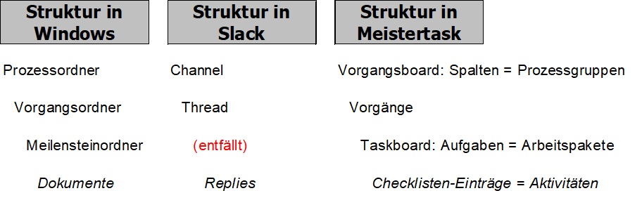 In jedem Tool finden sich die gleichen Prozessnummern und -bezeichnungen. Das sind keine technischen Schnittstellen, sondern regelbasierte. Technische Schnittstellen – wie sie z. B. Meistertask und Trelloboard für Slack anbieten und umgekehrt – funktionieren nämlich meistens nicht: die Tools „denken“ in unterschiedlichen Granularitäten und bekommen deshalb die „technische Relationierung“ nicht hin (also so etwas wie: „Einem Channel in Slack entspricht ein Paket im Aufgabenboard auf Trello, linke Spalte“).