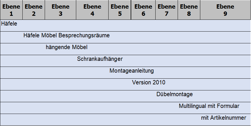 Abbildung 3 zeigt so eine Ordnung, die diesmal aus einem Privatunternehmen stammt. Es ist ein Einrichtungshaus für Bürolandschaften, das u.a. auch Beschläge der Firma Häfele verwendet. Liebevoll hat ein Raumplaner die dazu gehörigen Dokumente in eine Struktur gebracht, in der Ordner und Unterordner und Unterordner von Unterordner wie eine Kaskade bis in die neunte Ebene reichen. Das Ziel war offenbar „pro Dokument ein Ordner“.