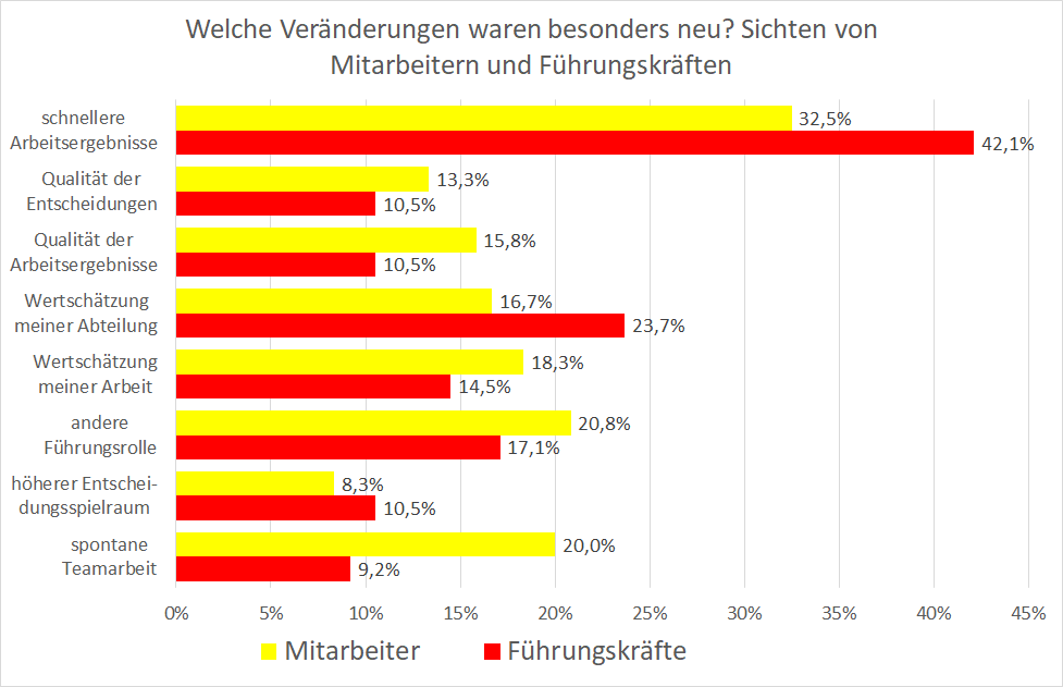 Die Unterschiede sind oft nicht sehr groß. Ganz deutlich waren sie bei dem Punkt „schnellere Arbeitsergebnisse“. Das war zwar beiden Gruppen am deutlichsten von allen Themen aufgefallen, aber mit unterschiedlicher Ausprägung. Den Führungskräften war diese Erfahrung mit 42 Prozentpunkten fast 10 Punkte wichtiger als den Mitarbeitern.