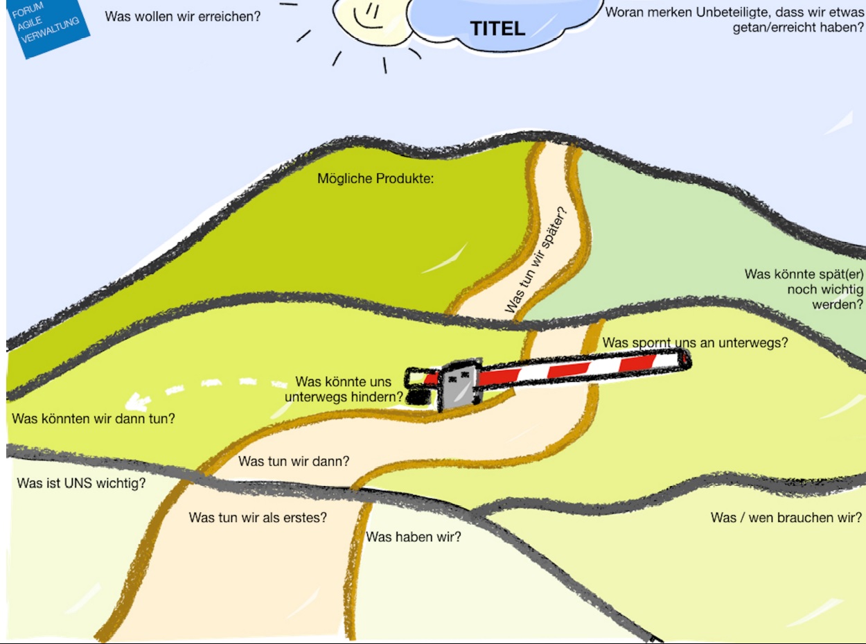 Ab diesem Punkt gibt es verschiedene Methoden, ein Canvas zu be-er-verarbeiten. Der Moderator kann die Reihenfolge der Punkte vorschlagen, an denen die Gruppe sich entlanghangelt. Das wäre dann ein linearer Weg, das nicht-lineare Modell mit Inhalten zu versehen. Oder – und das liegt mir persönlich mehr – er lässt die Teilnehmer zu Beginn nur einen Titel für das Projekt finden und Fragen zum Verständnis der Faktoren klären. Und dann beginnt jeder Teilnehmer damit, seinen eigenen Weg durch die Canvas-Landschaft zu erkunden und auf Post-It’s seine Antworten zu notieren.