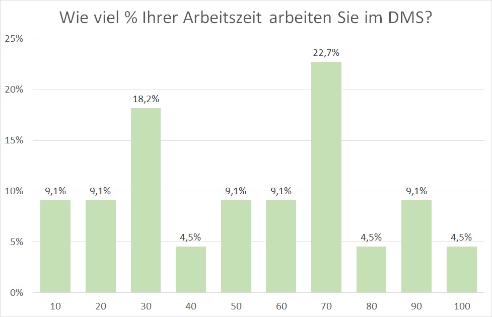 An diejenigen, die aktiv mit einem DMS arbeiten (in absoluten Zahlen etwas über 20 der Teilnehmer:innen), stellte ich dann die Frage: „Wie viel Prozent Ihrer Arbeitszeit arbeiten Sie im DMS?“