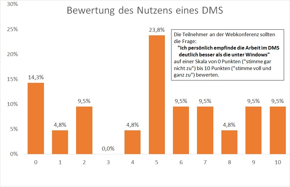 Ein Drittel der Befragten vergaben dabei vier Punkte oder weniger, das heißt sie empfanden das DMS als umständlicher als das Arbeiten unter Windows. Ein rundes Viertel sah keinen Unterschied (fünf Punkte). Und 43 Prozent sahen einen Fortschritt durch die Einführung des DMS.