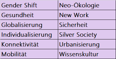 Das Institut des Zukunftsforschers Matthias Horx zum Beispiel teilt mit, es habe 12 Megatrends festgestellt: