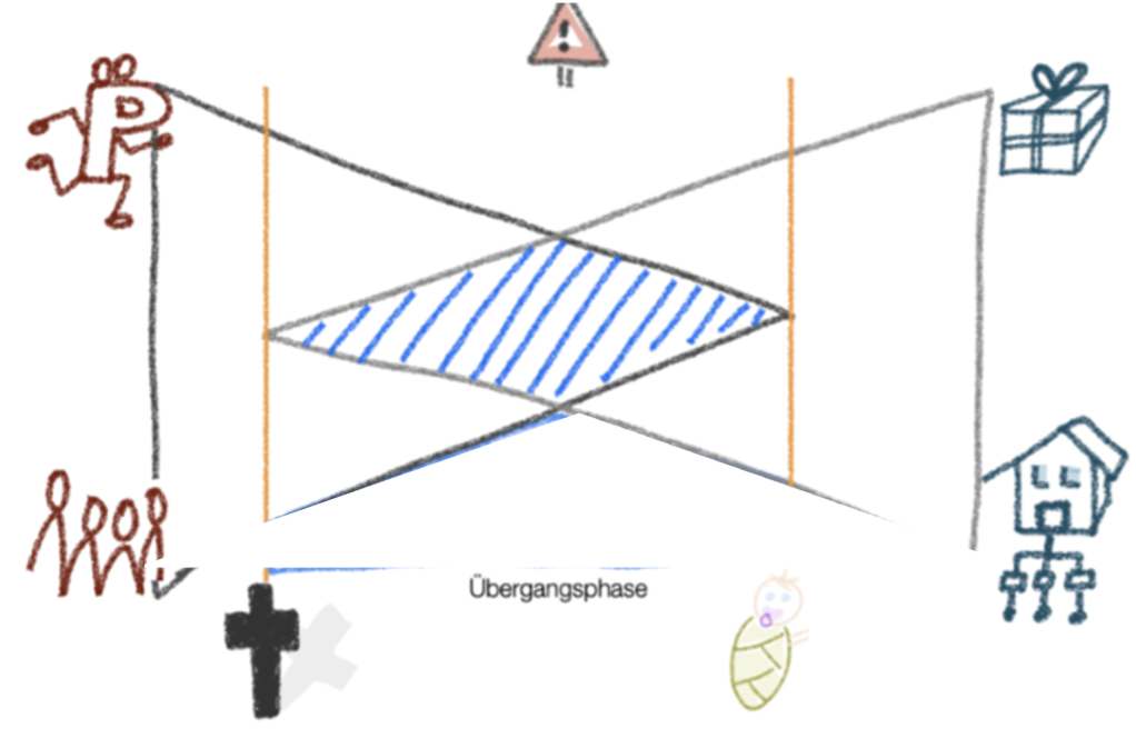 Nach dem eher vehementen Freiraum ganz links kommt der Moment, wo das Projekt sich dem Regelsystem wieder annähern muss und auf es zu arbeitet – bis hin zu dem Punkt, wo die Stammorganisation immer mehr den Stab übernimmt. Im Bild oben wird dieser Moment schön durch die orangenen Linien gezeigt, an denen jeweils die beiden Wirkdreiecke produzierendes Projekt > und abnehmende Organisation < sich treffen und Verantwortungen und Gestaltungsmächte neu organisiert werden. In der Realität sieht man solche farbigen Linien leider keine und ist es hohe Kunst des Projektmanagements und braucht viel Projekterfahrung, diese Zeitpunkte der Bedeutungswenden zu erkennen. Und entsprechend adäquat zu handeln.