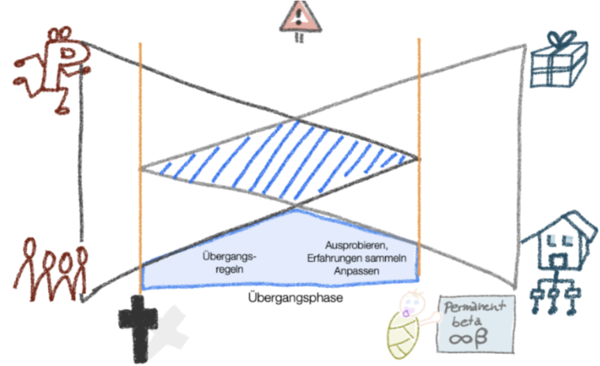 Was Projekt und Umsystem hier hilft, ist ein formuliertes «Übergangsreglement» – mit Verfallsdatum: Wenn alle Beteiligten wissen, dass für eine zeitlich befristete, überschaubare Weile mit eigens gemeinsam von Projekt und beteiligtem Regelsystem formulierten Übergangsregeln, die situationsangepasst und adaptiv oder gar agil sind, gelten, bietet das die von allen Beteiligten dringend benötigte Sicherheit, Klarheit, Orientierung …. Bei manchen allfällig sogar Freude am Ausprobieren und Erfahrungen sammeln – weil es ja automatisch wieder aufhört. Und erleichtert die temporäre Koexistenz zwischen Projekt und Regelorganisation immens.
