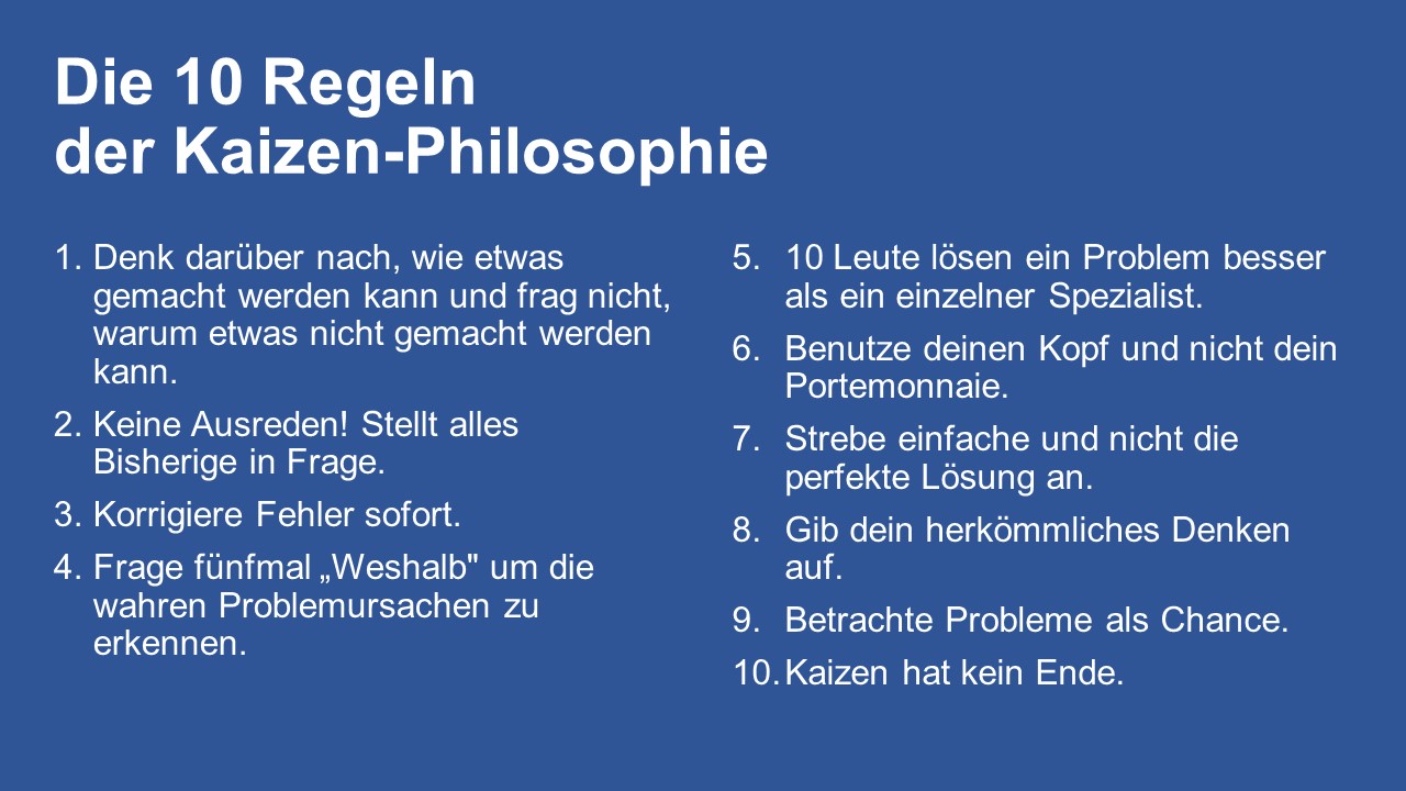Kaizen ist kein Projekt mit einem definierten Beginn oder einem festgesetzten Ende, sondern findet immer und fortlaufend statt. Es ist damit keine einmalige Geschichte, sondern findet ständig statt. Es gibt immer etwas, was man verbessern kann. Das heißt nicht, dass wir jeden Tag „Verbesserungsideen“ entwickeln müssen. Dafür gibt es die regelmäßigen Kaizen-Runden in Form von Reviews und Retrospektiven. Aber es bedeutet, mit wachen Augen durch den Alltag zu gehen und im Sinne der 10 Regeln der Kaizen-Philosophie Fehler – sofern möglich, sofort – nachdem wir sie entdeckt haben, zu beheben.