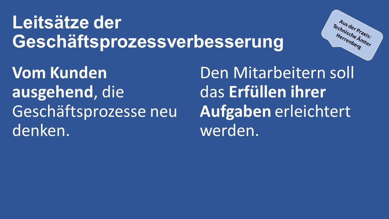Wie so etwas in der kommunalen Praxis aussehen kann, zeigt das Beispiel des städtischen Bauhofs in Herrenberg, der das eherne Prinzip der kontinuierlichen Weiterentwicklung und Verbesserung in sein Alltagsverständnis gänzlich integriert hat. Und dies mit sichtbaren Erfolgen. Verbesserungsmaßnahmen müssen sich an dort an zwei Leitprinzipien messen lassen, nämlich ob sie a) dazu beitragen, dass für den „Kunden“ (Bürger, Auftraggeber, Verwaltung …) ein Mehrwert geschaffen wird und b) eine Arbeitserleichterung für die Mitarbeiter erzeugt wird. Es geht also eben nicht darum, Prozesse und Abläufe möglichst kostensparsam zu optimieren, sondern für alle Beteiligten spürbaren Nutzen zu erzeugen.