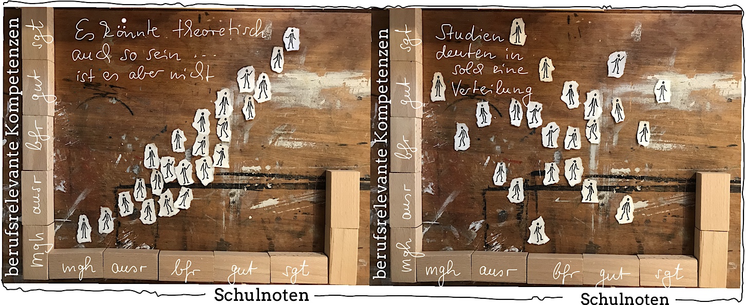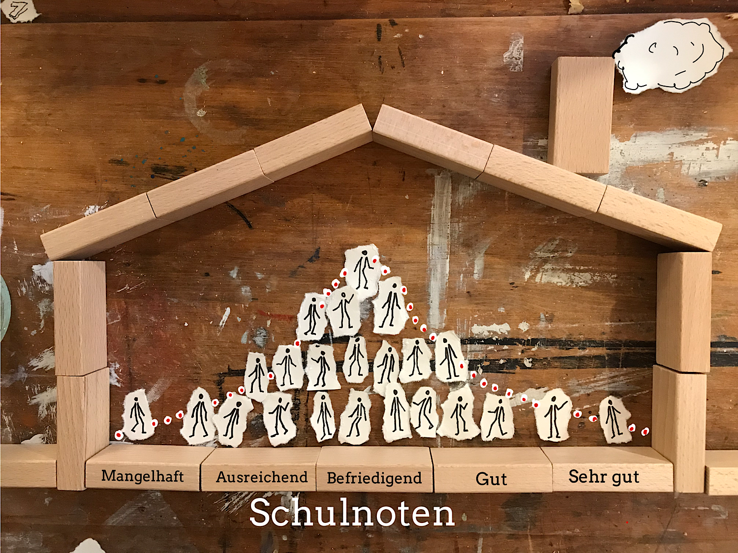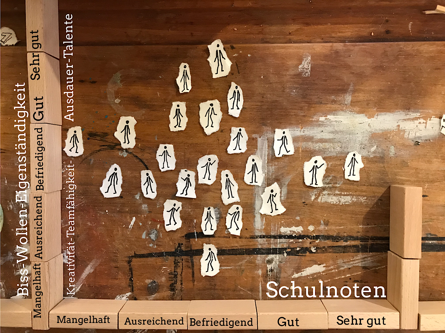 Ja klar, die letzte Visualisierung könnte natürlich auch so sein: Schule sehr gut, alles sehr gut. Entspricht aber nicht der Wirklichkeit. Man schaue nur um sich herum und frage nach Schulnoten. Dann erfährt man was Studien zeigen: Es gibt keinen Zusammenhang zwischen Schulnoten und beruflichem Erfolg. Zu Lebenserfolg noch weniger.