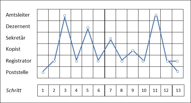 Abbild 1: Der Fluss eines Bürgerantrags durch ein Amt lt. Preußischer Registraturordnung. Alles lief über den Registrator. Er vergab die Aktenzeichen. /Anmerkung 2/