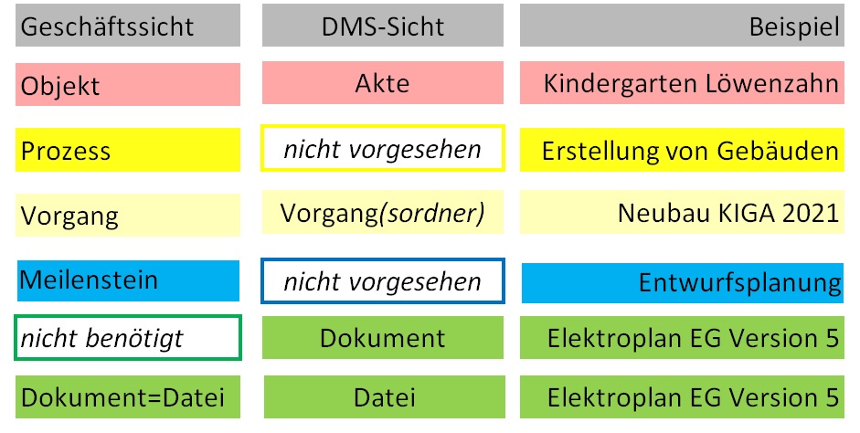 Die Abteilung „Hochbau“ denkt und kommuniziert in Objekten (konkretes Gebäude Kindergarten Löwenzahn) und in Prozessen („Neubau“). Mit dem Prozess sind bestimmte Berechtigungen und Rollen verknüpft (Wer ist im Team und hat Zugriff? Wer ist federführend („Vorgangseigner“)? Wie sieht die Unterordnerstruktur aus („Meilensteine“), die sich bei Neubauten an den Phasen der HOAI orientiert?) Für das Objekt bietet das DMS die Möglichkeit an, eine Kindergartenakte zu bilden. Die Prozesslogik wird überhaupt nicht abgebildet.