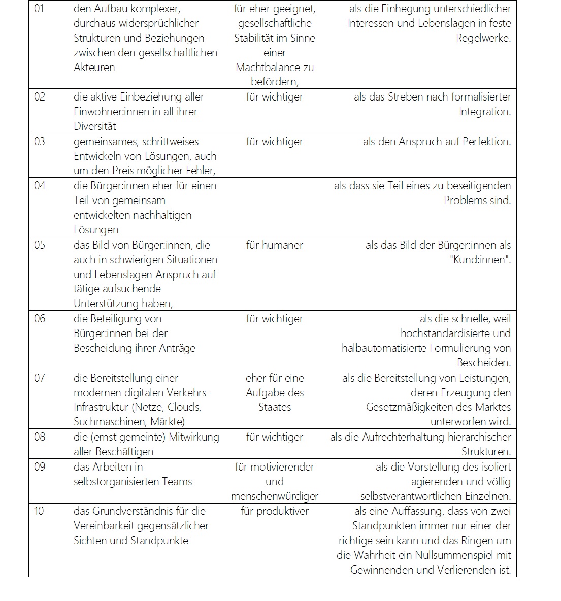 Wir haben uns für die Bezeichnung „Werterahmen“ entschieden. Die im Buch zu erarbeitende(n) und zu detaillierende(n) Vision(en) soll(en) dazu dienen, bestimmte Werte zu transportieren. Verwaltung ist für uns immer demokratische, partizipative, offene, transparente Verwaltung – und darüber möchten wir mit allen Beteiligten am Anfang einen ersten Konsens herstellen.