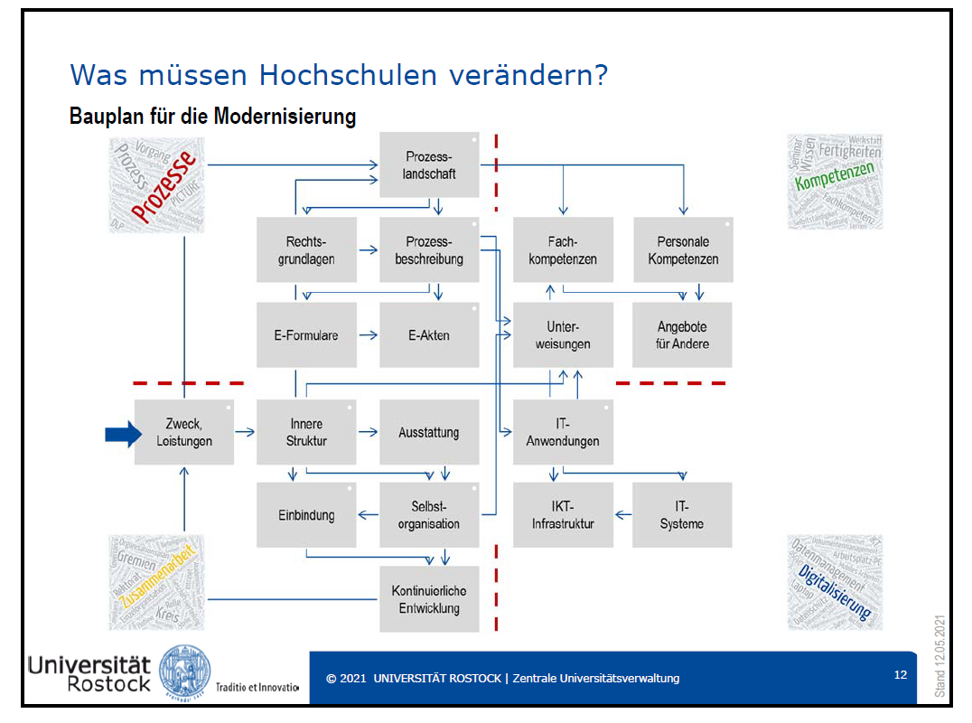 Im zweiten Fachimpuls zum Thema „Was machen Hochschulen und was müssen sie verändern“ präsentierten die Rostocker Kolleg*innen ihr Modell einer agilen Hochschulorganisation. Dieses besteht aus insgesamt acht Leistungsbereichen (Hochschulführung, Studium, Forschung, Gesellschaft, Personal, Ressourcen, IKT, Infrastruktur), drei sogenannter „Konkretisierungsebenen“ (Hochschule, Einzelorganisation in der Hochschule, Organisationseinheit in der Einzelorganisation) und vier Handlungsfelder (Zusammenarbeit, Kompetenzen, Prozesse, Digitalisierung). Diese vier Handlungsfelder bilden das Gerüst für einen Modernisierungsbauplan