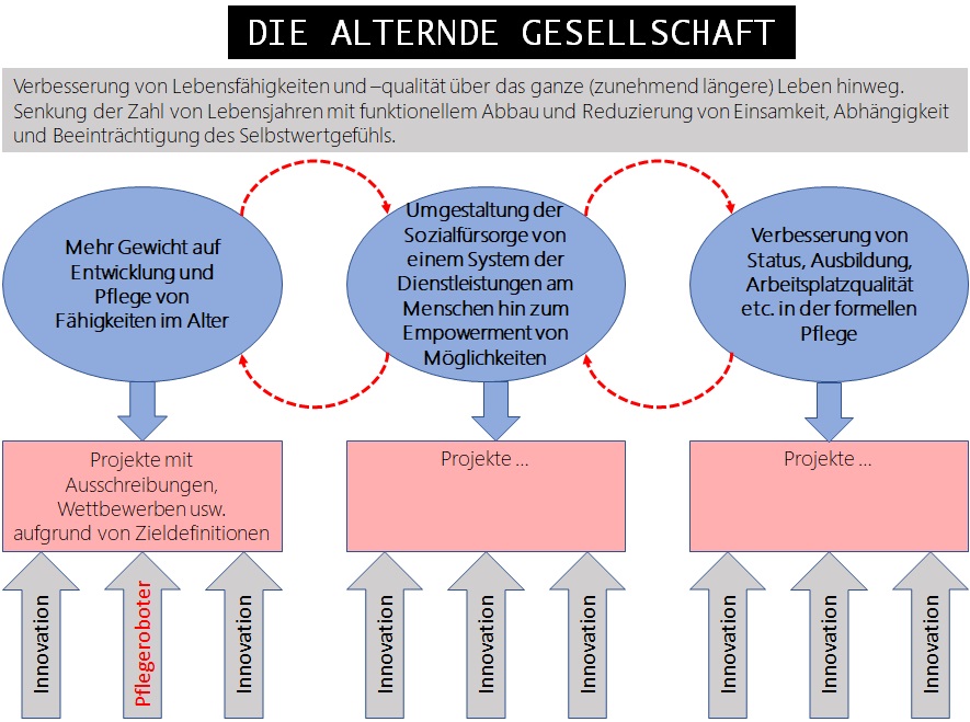 Auf der Ebene dieser Projekte können alle möglichen Maßnahmen innovativ entwickelt, ausprobiert, evaluiert und abgewogen werden, so dass an dieser Stelle die Innovationen Bottom Up erfolgen. Dabei könnte auch das Thema „Pflegeroboter“ einen angemessenen Platz finden. Und nach dem, was wir oben gesehen haben, geht es dabei ja nicht um Entlastung des Pflegepersonals, sondern um die Erhaltung von geistigen Fähigkeiten.
