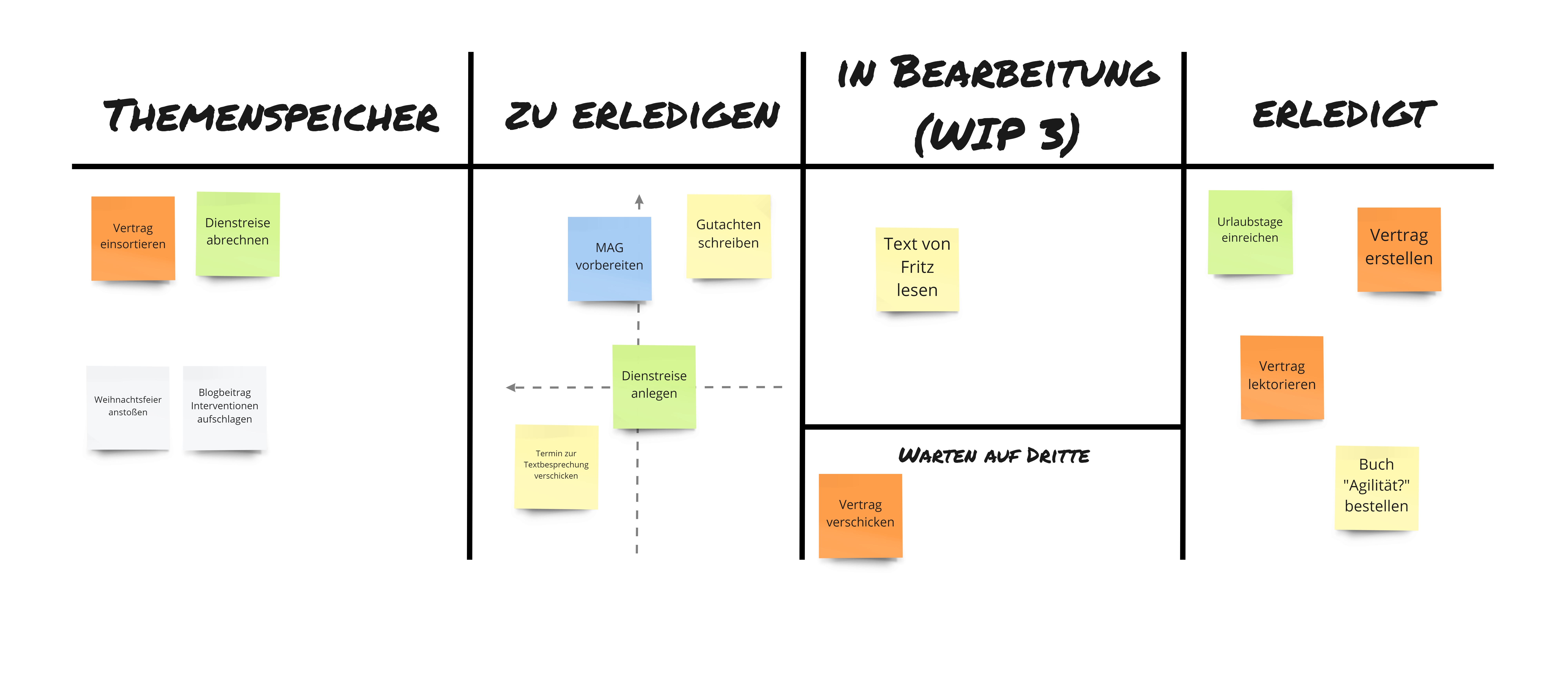 Wenn man diese Schritte beachtet, kommt man in kurzer Zeit zu einem funktionierenden Rahmen für die Arbeit mit einem Kanban. Die niedrige Hürde in der Erstellung eines solchen Boards macht den Reiz aus, es einfach zu probieren. Denn im schlimmsten Fall hat man nicht viel investiert und ist um eine Erkenntnis reicher.