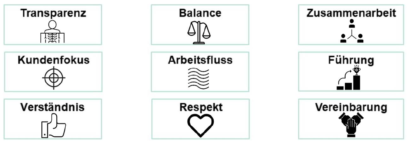 Neben den Werten im Agilen Manifest besitzt jede Methode ihr eigenes Werteset. Vergleicht man die Werte des Kanban (siehe Abbildung 4) mit denen des Agilen Manifests (siehe Abbildung 3), wird klar, warum es den agilen Methoden zugeordnet werden kann: Kanban bedient sich eines agilen Wertekanons, welcher den Menschen ins Zentrum stellt.