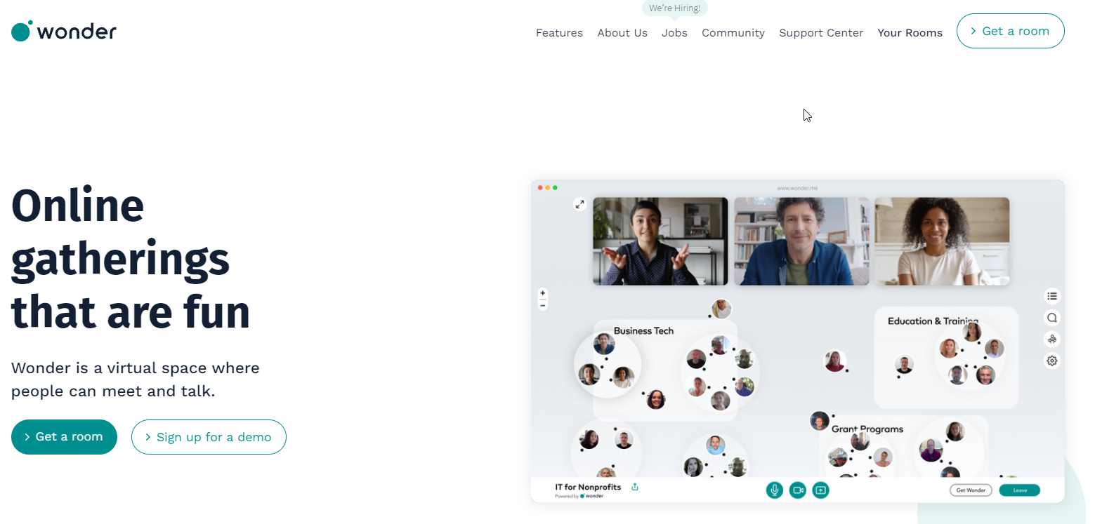 Wonder ist eine Plattform, bei der die Teilnehmer und Teilnehmerinnen sich mit ihren Icons frei in einer Fläche zu bewegen, in Dialog treten oder sich zu mehreren in einem Raum treffen und dort diskutieren können. Die Darstellung ist zwar keine 3D-Simulation, sondern eine Art Draufsicht von oben, erzeugt aber eine gewisse Räumlichkeit. Diese Darstellung ist schon viel angenehmer, als die üblichen Breakout-Bereiche anderer Anbieter.