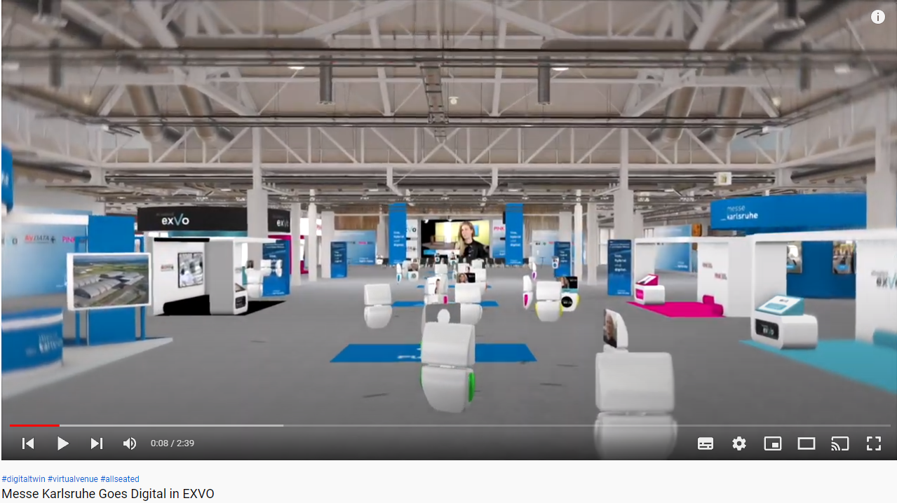Allseated Exvo geht deutlich weiter als Wonder. Hier können verschiedenste Formate wie Events, Meetings, Messen in einer 3D-Simulation stattfinden. Das Bild zeigt einen Screenshot virtuellen Veranstaltung in der Gartenhalle der Messe Karlsruhe.