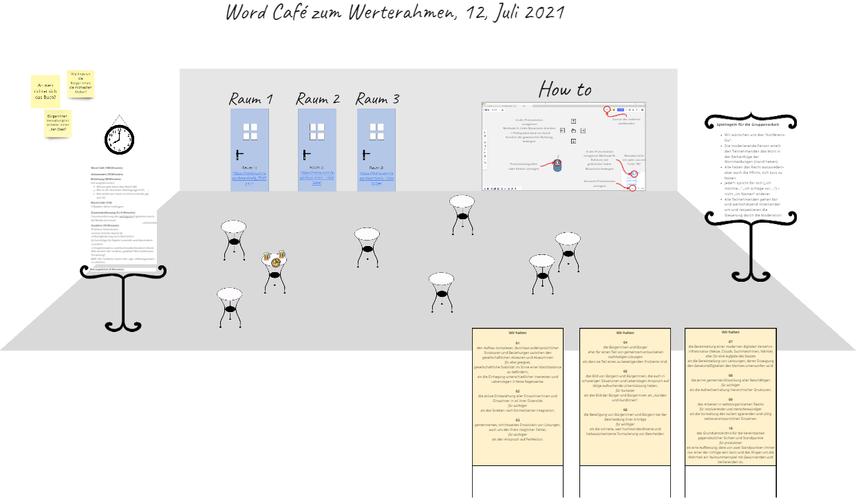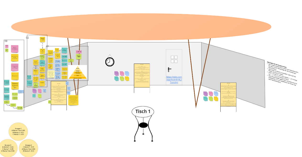 Die Teilnehmenden wurden in einem Foyer begrüßt und fanden dort eine Tafel mit dem zeitlichen Ablauf, ein How-To für den Umgang mit Miro und Links zu drei Unterräumen (Unterboards). Die Links wurden einfach auf die stilisierten Türen gesetzt. Das ist intuitiv verständlich.