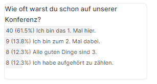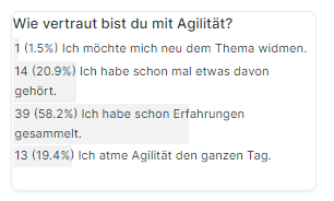 Des Weiteren dürfen wir nicht vergessen, dass es Menschen gibt, die sich neu der agilen Verwaltung widmen oder bereits Erfahrungen gesammelt haben. Das zeigen auch unsere Umfrageergebnisse auf der Konferenz: