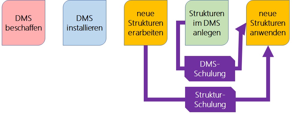 neue Strukturen anwenden: Die „Kund:innen“ des Projekts, nämlich die Mitarbeiterinnen und Mitarbeiter, müssen (bzw. dürfen) ihre Arbeitsweise umstellen. Sie müssen selbst neue Arbeitsweisen erproben, vielleicht auch im Team Absprachen treffen oder sogar Änderungen im DMS einfordern, wenn die dort angelegten Strukturen sich in der Praxis nicht bewähren.